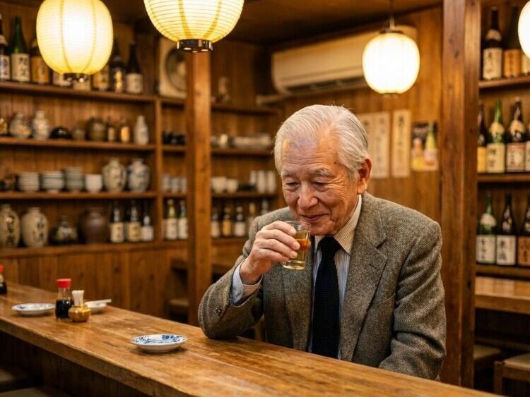 居酒屋のカウンターに座る白髪のジェントルマン